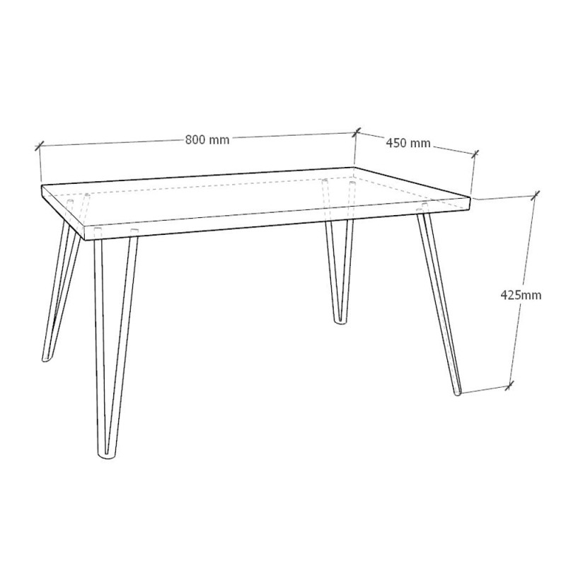 Table basse composée d'un plateau rectangulaire et de 4 pieds épingles.